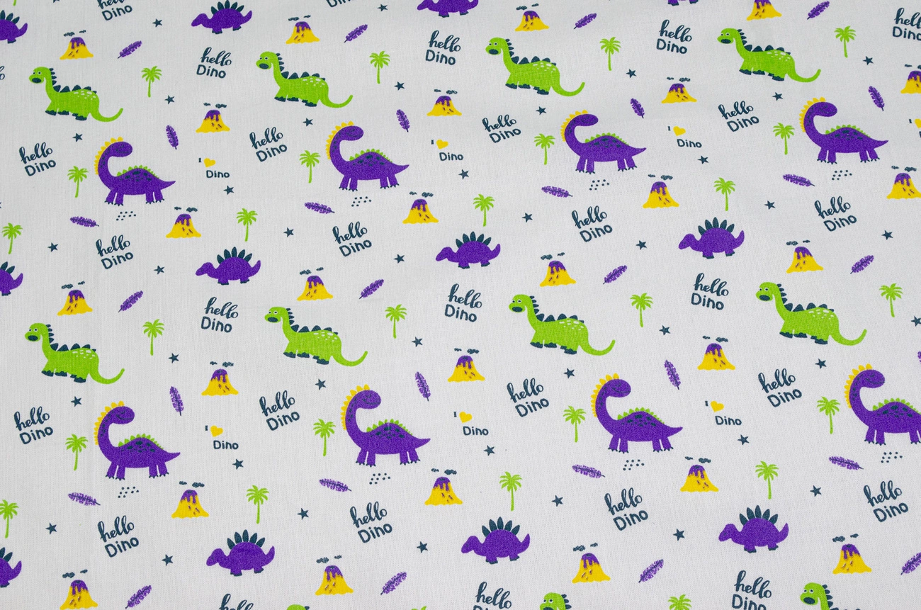 Бязь набивна "Динозаврики" салатово-фіолетова 150см (140г/м2) 154920
